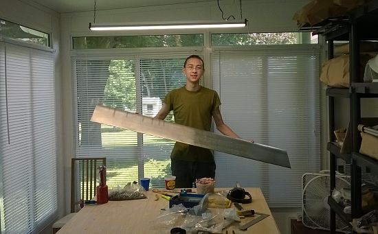 We chose to begin with the aluminum wing kit. The first step created some concerns. We started with black 3M 800 grit paper which makes short work of deburring corners and polishing out scratches. One of the chapter's tech counselors suggested we look into sandpaper materials approved by the FAA. Sure enough, there are concerns with the silicon carbide used in many of the finer papers. The FAA's AC-43.13-1B has conflicting information, with one table saying don't use it but a paragraph a few pages later says it's suitable. An older NASA document recommends it. The UK's CAA had a recent paper recommending one "avoid" using silicon carbide on aluminum for fear of it embedding in the material. We chose to keep the one aileron we'd finished with it but replaced all the paper with aluminum oxide sheets. In finer grits, this can be difficult to find. Nena's has it to 400, and Advance Auto has polishing discs to 800. For bigger jobs we got maroon Scotch-Brite 7447 from Grainger, which is a bit coarser than 400. (The finer Sctoch-Brite pads are silicon carbide.)