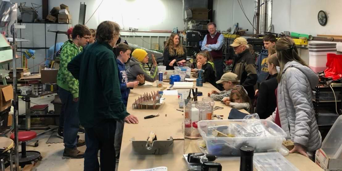 On April 18th, the chapter hosted a Tazewell county 4-H group interested in learning about airplane construction. About 16 children and their parents attended. Karl Kleimenhagen gave a brief introduction and slide show, followed by a question and answer time along with Bill Larson and Andy Plouse. The kids were then free to roam the hangar and ask questions of the chapter members about the airplanes on hand and the tools used. At the table used by the teens building the Zenith Cruzer, an impromptu demonstration was made on riveting and deburring aluminum.