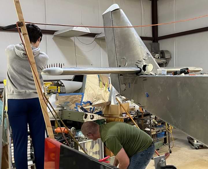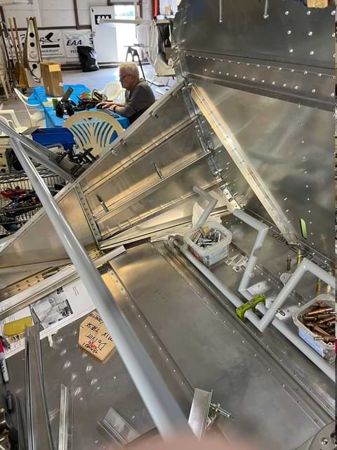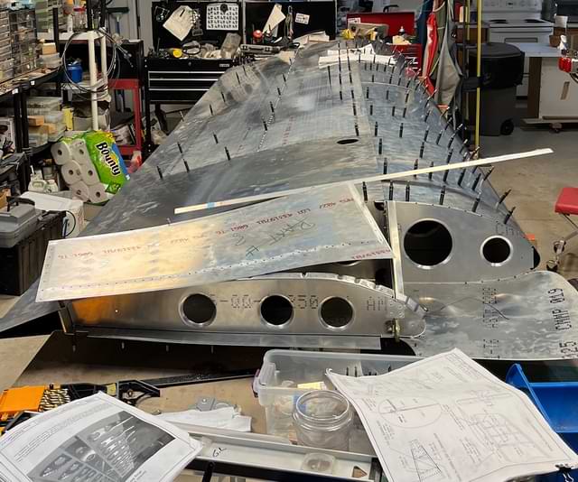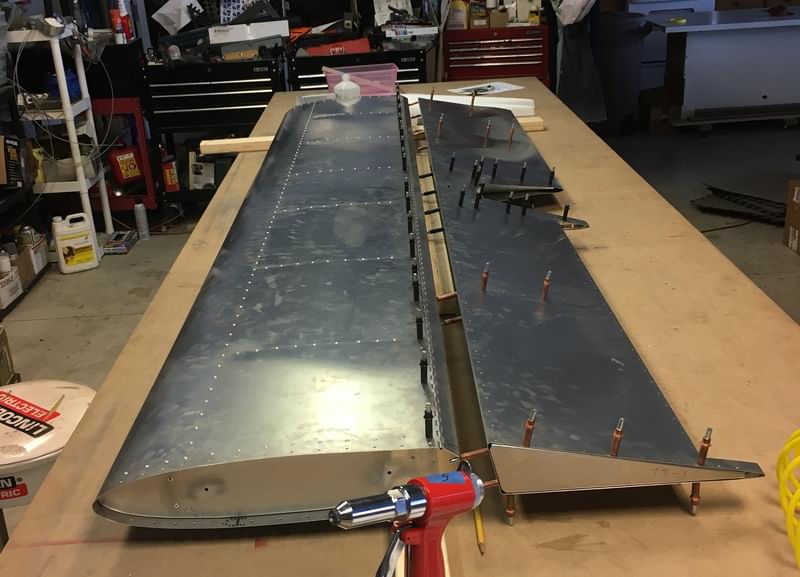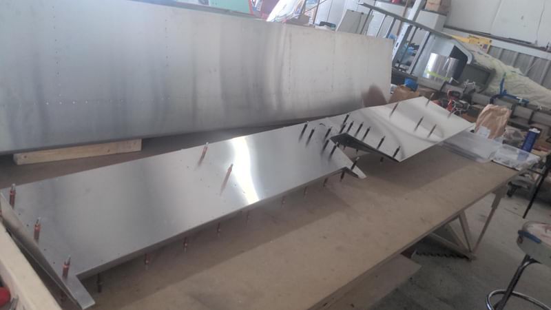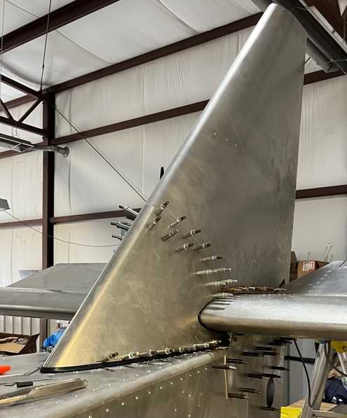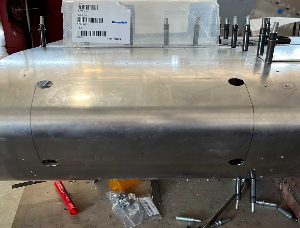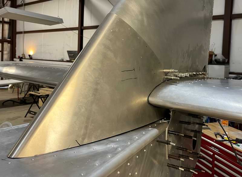 1 hr: Paxson, Hope, Jude, Bobby, Julian, Zee - Remove fin and rudder. - Drill out rivets at the tail whose holes hadn't been properly deburred. - Back and forth on a redesign of the factory elevator stop. - Ditto for the upper elevator cable fairleads. - Rivet trailing edge of right wing back on. - Begin fitting wing tip to right wing. 1386 hr cumulative