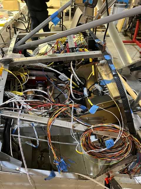 2 hr: Zee, Abel, Samuel, Soumik - Finish left and right wing struts and attach. Set airplane back on the ground. - Begin routing wires. Discuss location of buss bars. 1503 hr cumulative