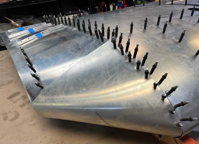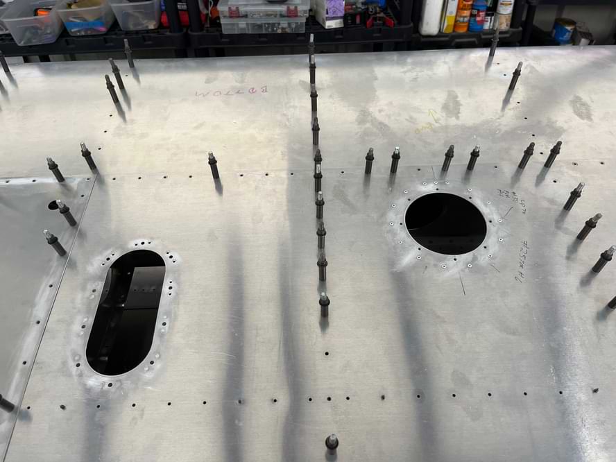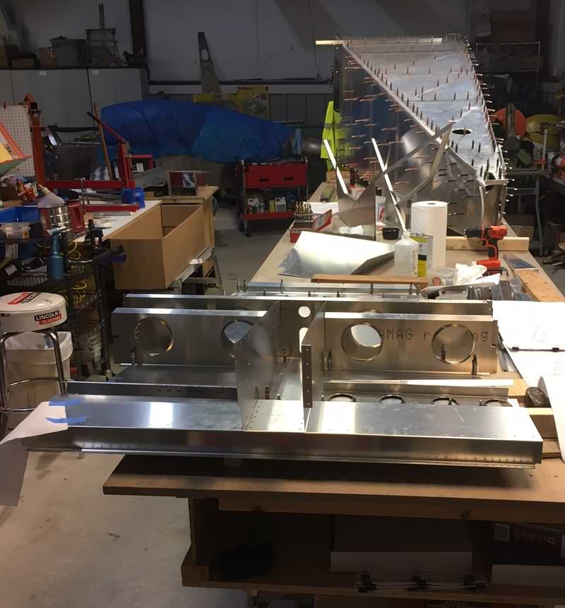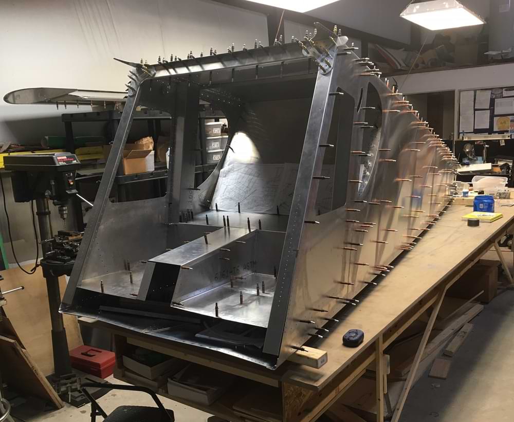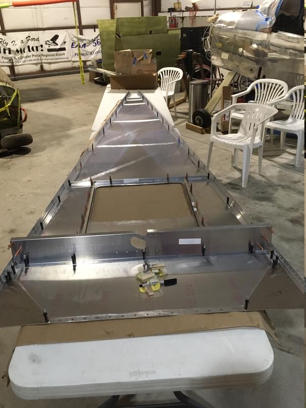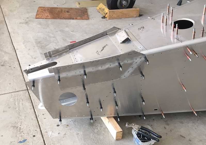 2.5 hr: Killian, Luke, Nolan, Isaac - Deburr top skin and stiffeners; cleco. One stiffener/bracket was not fully drilled, and Rob will demonstrate the fix next week. - Cleco aft bulkheads to bottom skin. Cleco side skin assemblies to bottom skin. - Prepare rear spar carry-though and cleco. 166 hr cumulative