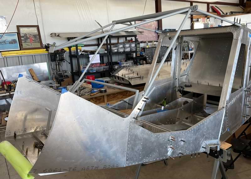2.5 hr: Nolan, Ishan 2.0 hr: Paxson 1.5 hr: Killian 0.5 hr: Eli - Rivet down the front cabin floor. - Attach and drill the cabin's steel cage. - Begin cutting out the ABS wing tips. - Drill last holes in wing root skin and form its lateral stiffeners. 724 hr cumulative