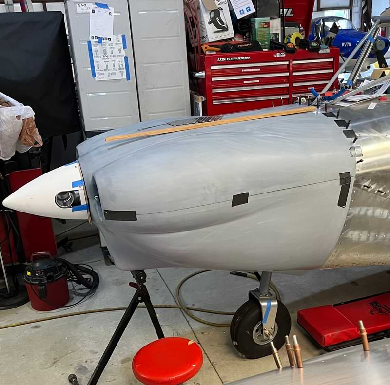 2.5 hr: Luke, Killian, Collin, Adrienne, Abel, Paxson - Install fuel sender. - Begin fabricating brackets for the wing's trailing edge wiring. - Begin laying out installation of the pitot tube mast. - Prepare an access panel over the aft inboard edge of the fuel tank. - Torque prop spinner in place. Study fit of the cowling, finding several concerns, may have to add a blister. 1184 hr cumulative
