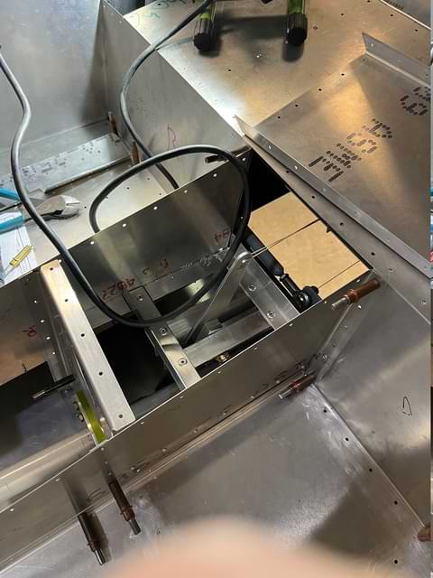 1.5 hr: Zee, Samuel 1 hr: Nolan, Ankith - Bolt eft flaperon sections together. Begin right side. - Study aileron motion limits (coming up short). Coupler is binding on its slot in the fuselage (the joys of CNC). - Continue routing aft wires under the seats to reach the panel. (Right side done.) 1565 hr cumulative