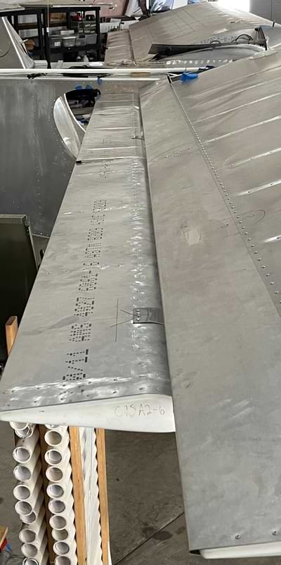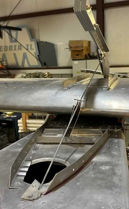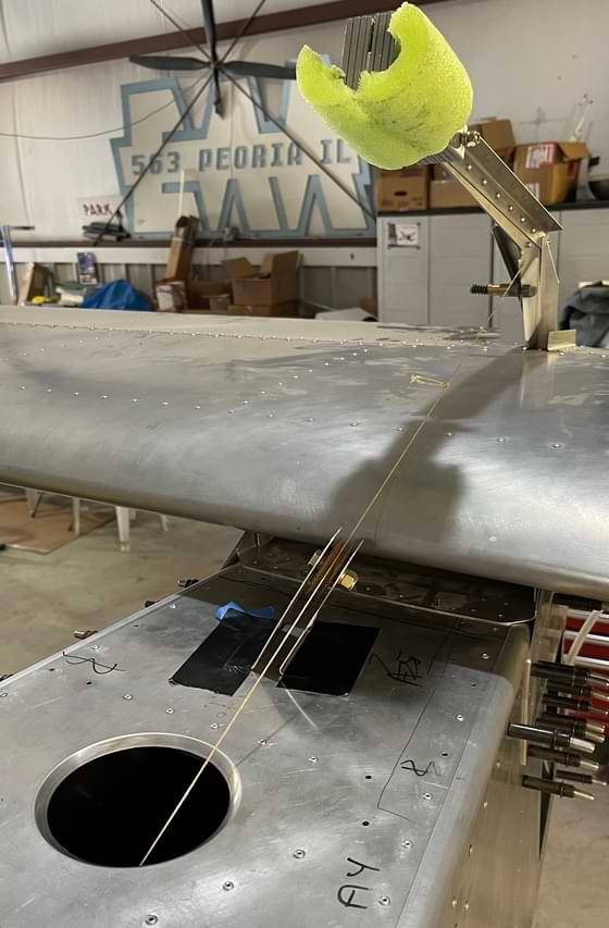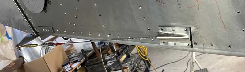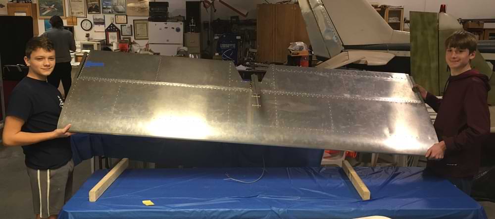 1 hr: Zee, Nolan, Grady 1.5 hr: Bobby, Julian, Able, Paxson - Remove rivets from right wing to access upper strut fitting, to install the strut fitting doubler which was left off. - Remove rivets from inboard trailing edge of right wing to install an aft spar doubler not shown on our kit's prints. - Finish both elevator cables. Finish left rudder cable, and begin right rudder cable. 1371 hr cumulative