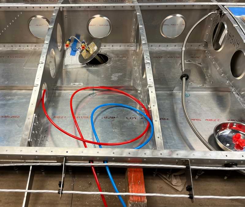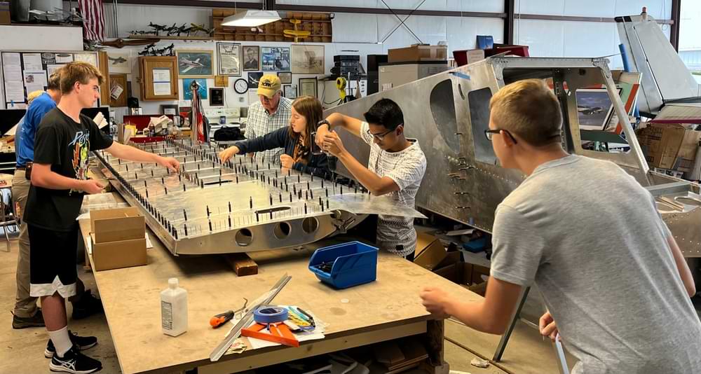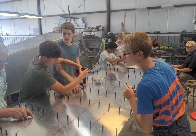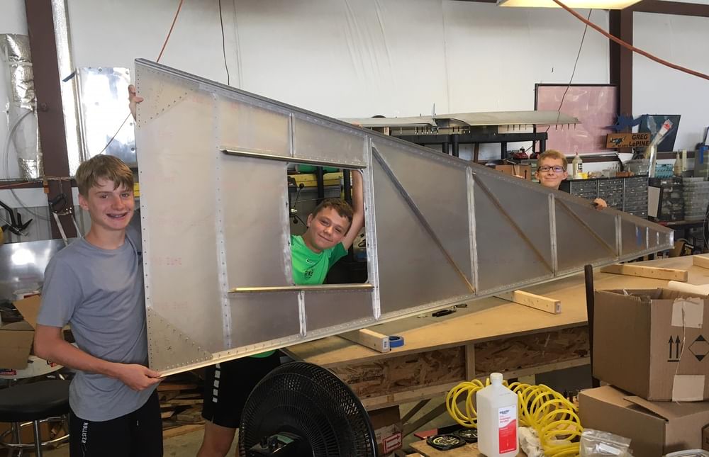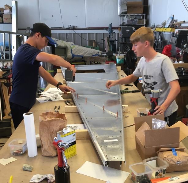 2 hr: Tyler, Grady, Charlie, Samuel, Trivid, Abel, Grace - Rivet on wing bottom skins. - Rivet on 3 of 4 flaperon brackets. - Change the trim motor wire bundle. - Construct the avionics tray. - Test re-routed fuel lines with air pressure, verifying fuel selector funtion. 1291 hr cumulative