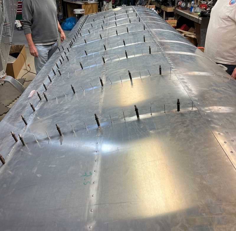 2 hr: Charlie, Julian, Paxson, Grady - Deburr bottom wing skin. Rivet on lateral stiffeners. - Fit wing root top skin and its angle. - Up drill landing light housing. - Trim top and bottom engine cowl. Begin to drill fastening holes. - Install forward bearing support for the control torque tube. 1248 hr cumulative