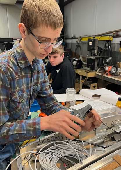 1 hr: Hope, Charlie, Killian, Paxson, Kagen, Zee 2 hr: Teyi, Ankith - Installed 2 of 4 flaperon counterweights. - Run flap motor wires to panel. - Run COM and transponder coax. - Begine running ADS-B coax. - Torque down all exhaust gaskets. 1533 hr cumulative