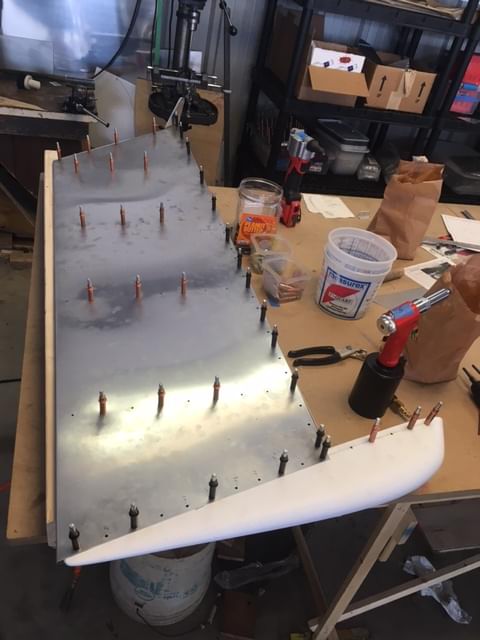 2 hr: Afzal 3 hr: Will 4 hr: Carter 5 hr: Isaac, Nolan - Finish stabilizer skelton riveting. Rivet down second side of stabilizer skin. Drill elevator hinge into stabilizer. - Collect parts, deburr, assemble fin. 90 hr cumulative