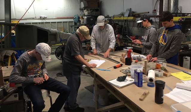 1 hr: Paxson 2 hr: Will, Nolan, Isaac, Killian - Resume work on elevator (Rob has returned). - Start to install flapperon mixer. - Finish reamering the left attach bracket of the rear carry through spar. - Start to install the reinforcing brace in the rear door posts. - Discussion of engine options. ULPower 350i selected. - Julian arrives for an introduction to the shop. He'll join us next month on the build. 237 hr cumulative