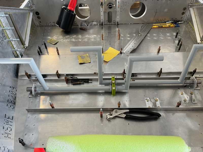 0.5 hr: Eli 1.0 hr: Wyatt, Zee, Killian 1.5 hr: Nolan, Adrienne 2.0 hr: Paxson, Ishan - Mount magnetometer in bottom wing skin. - Install and begin to rivet in place the new elevator bell crank assembly framework. - Rivet down belly skin, etc under right seat. - Begin to form the forward channels on the sides of the cabin aft of the firewall. 745 hr cumulative