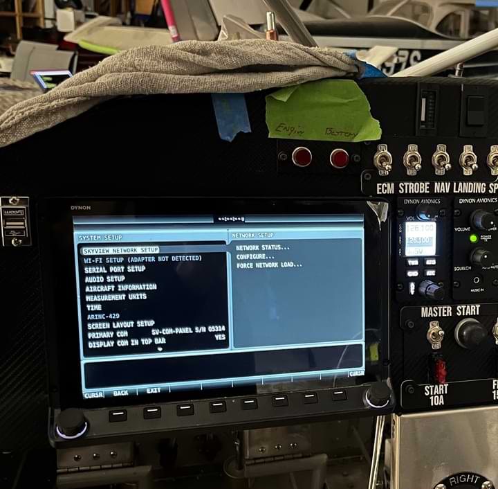 1.5 hr: Charlie, Samuel, Hope - Install last SkyView network cable. - Update SkyView software in the airplane. - Shorten seat cushion fastening screws in co-pilot seat pan. - Try to install copilot seat; strip nutplate; begin repairs. - Identify CAN wires; decide where to mount; not sure about ground wire. - Install COM antenna and cover for belly hatch. 1628 hr cumulative