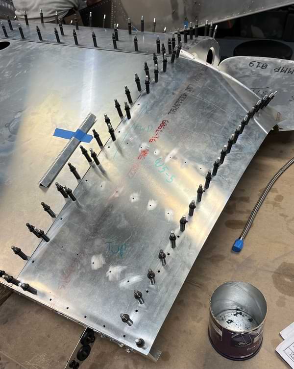 1.5 hr: Grace, Wyatt, Zee, Killian, Ishan, Paxson - Rivet inter-rib stiffeners to bottom of wing top skin. - Drill out and re-rivet the reinforcing plate for the magnetometer (bottom wing skin). - Fashion the last forward channel for the cabin sides. - Finish riveting the bottom skin of the cabin. - Start riveting the seat base structure to the cabin sides. - Continue work on fuel tank installation. - Begin drilling the engine mount brackets to the forward longerons. 803 hr cumulative
